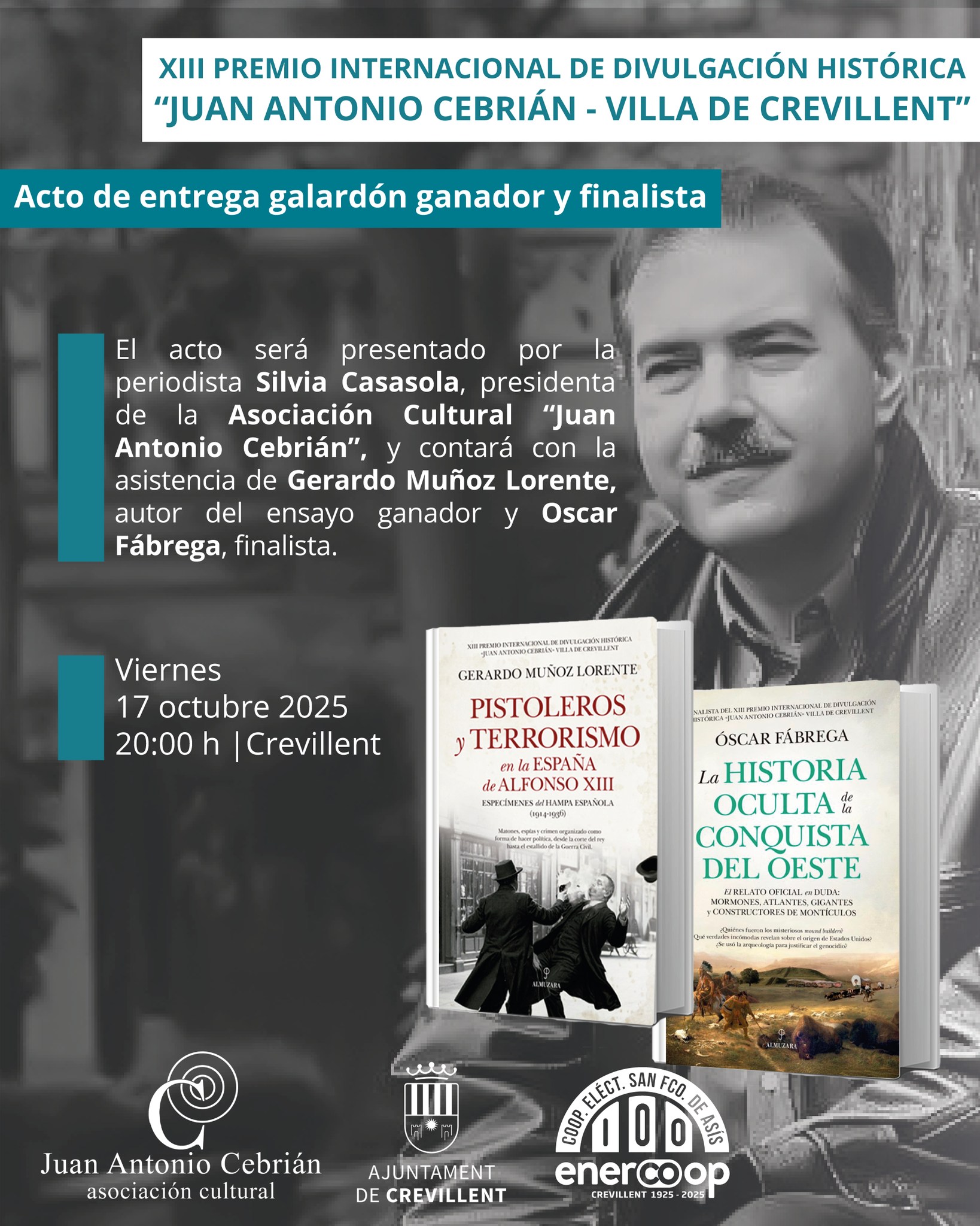 La Asociación Cultural Juan Antonio Cebrián tiene el placer de invitarte al acto de entrega del premio que tendrá lugar el próximo viernes 17 de octubre a las 20 horas, en el Salón de Actos de la Cooperativa Eléctrica de Crevillent(Grupo Enercoop) con motivo del su centenario.
